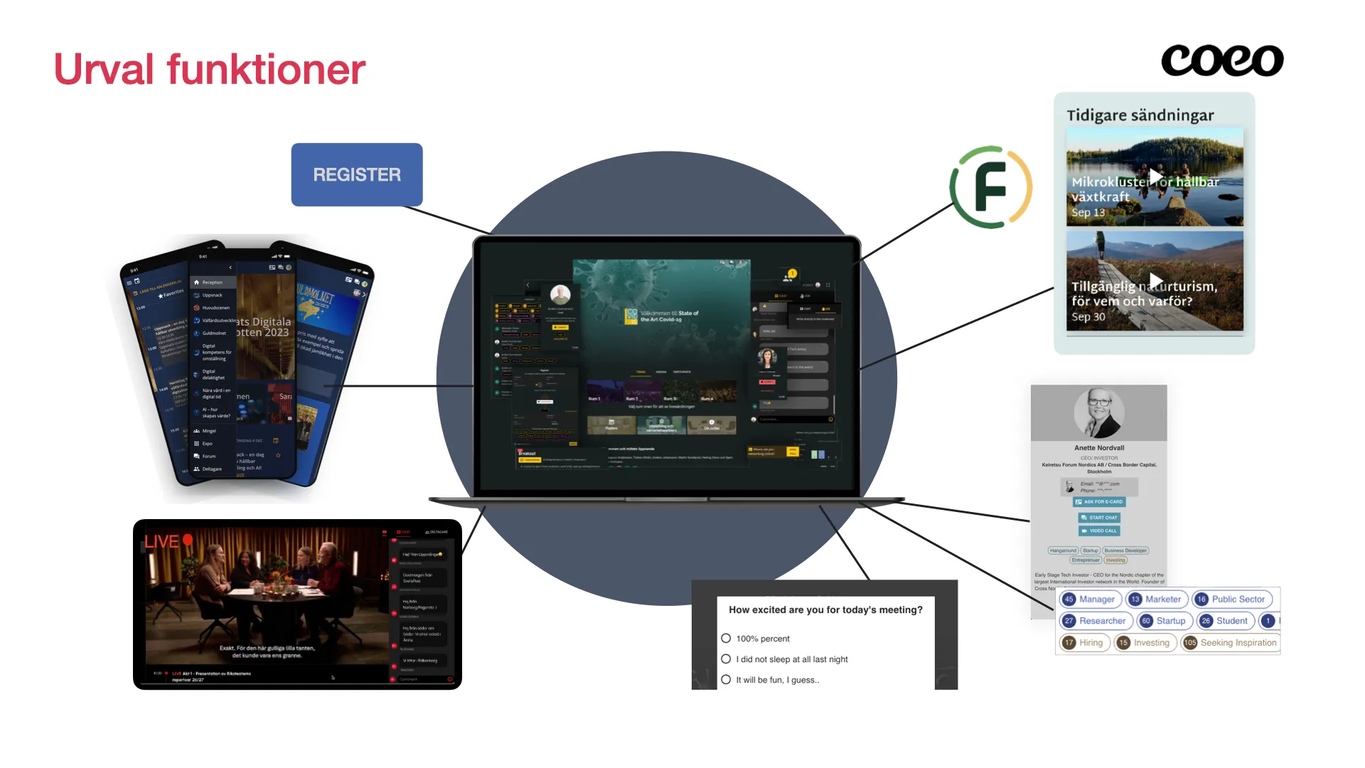 Coeos plattform är en flexibel helhetslösning som hjälper våra kunder att skapa proffsigare event, ökat deltagarengagemang och ökade intäkter för alla typer av genomföranden.